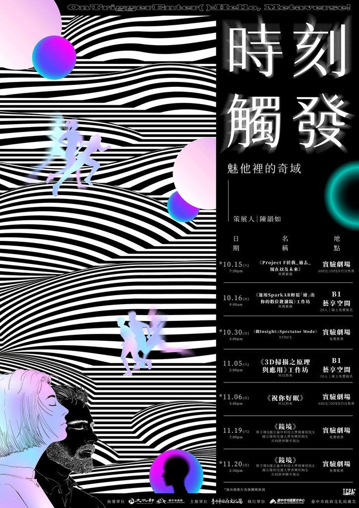 為題,旨在挖掘出劇場在科技範疇中的無限可能與多元發展,以數位科技的奇域引領大眾對於科技劇場的想像。「時刻觸發」重疊了從當下「時刻」到未來「觸發」的身體鏈結,隨著數位科技的全面啟動,關注焦點將回到身臨其境的體驗,即進入魅他空間,這個空間能使主體成為多重角色的參與者,以及多樣的虛擬分身,這意味著科技觸發出當下身體(OnBody)、虛擬身體(VirtualBody)進入到魅他身體(MetaBody) 的奇域視界作為此次科技劇場的呈現焦點。