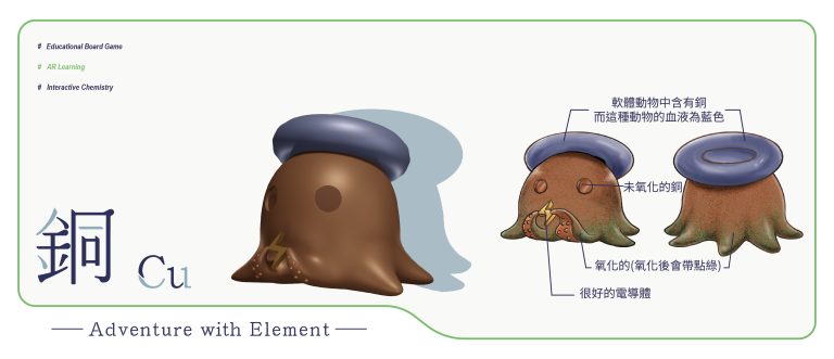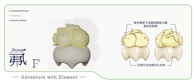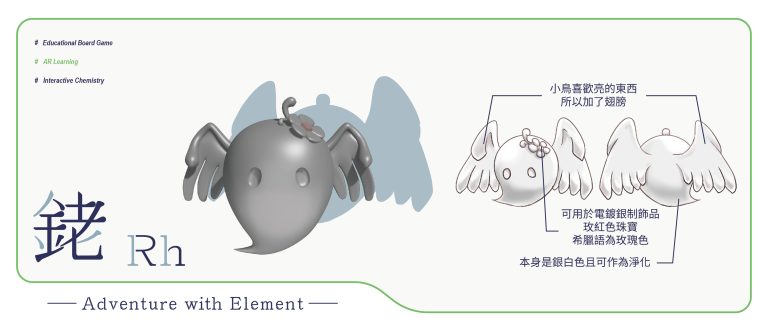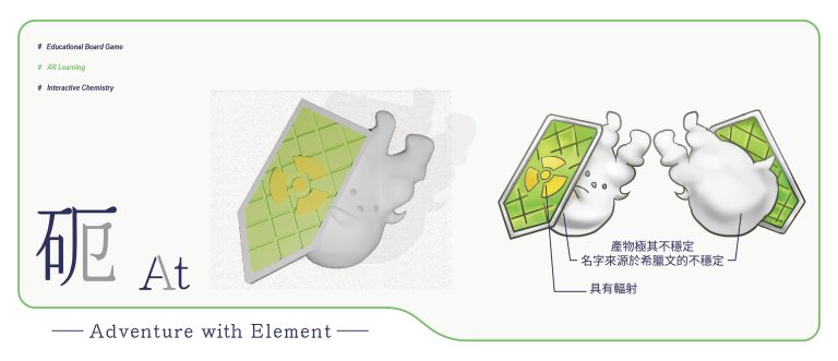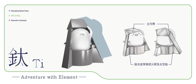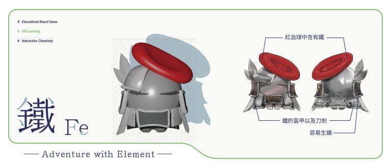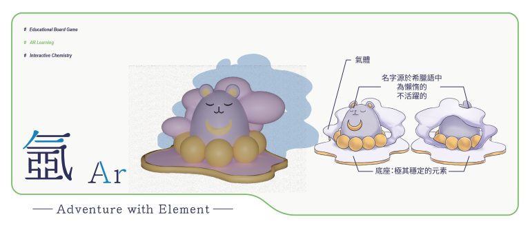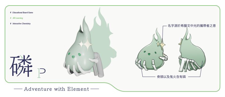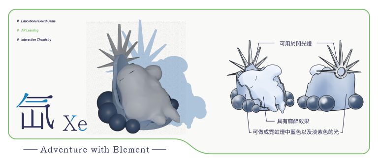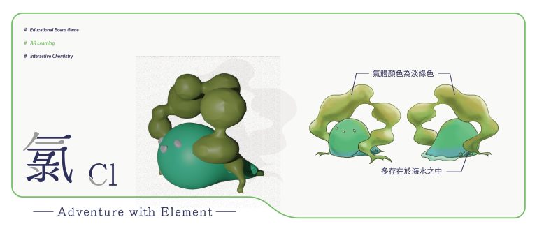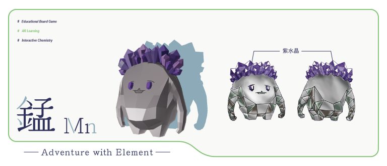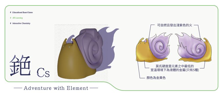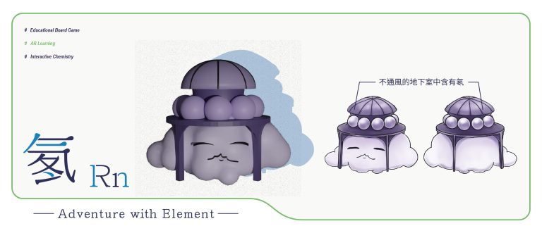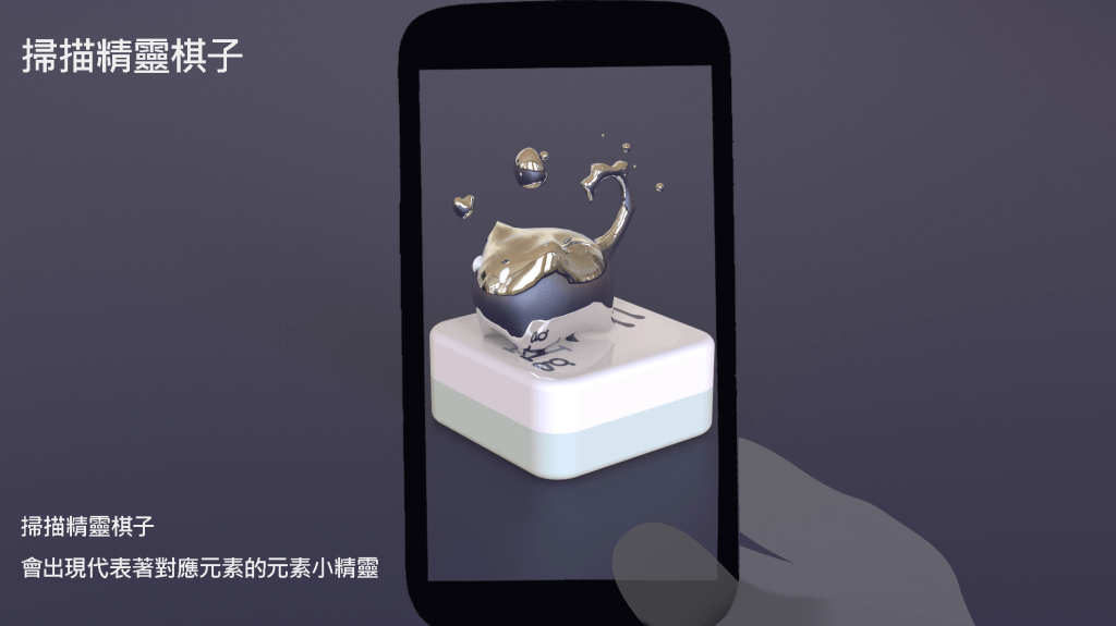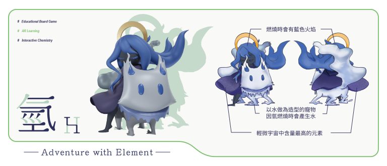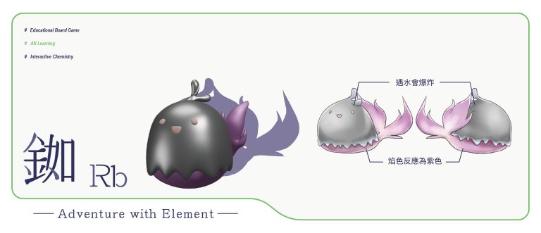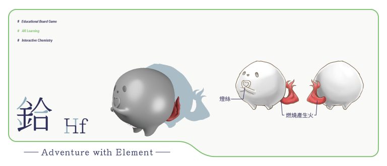 我們結合了AR,使玩家可以透過掃描棋子以及卡牌的方式去看到元素每位小精靈的樣貌和合成的小動畫,藉此增加玩家對該元素的印象。透過每個元素不同的化學性質、可製成的物品以及命名由來去繪製每位小精靈的樣貌,使每位元素精靈都成為獨一無二的存在。