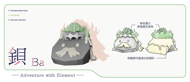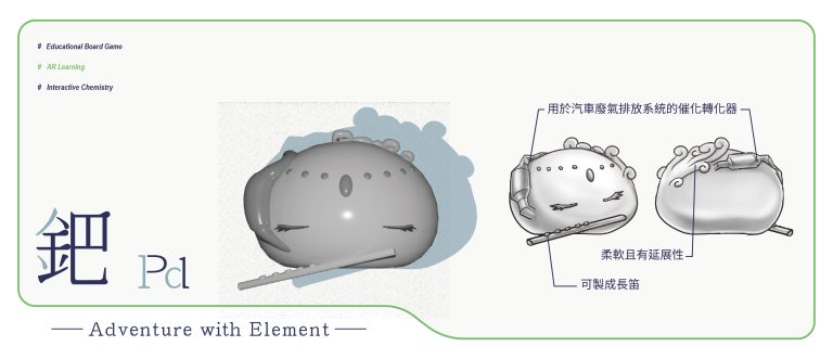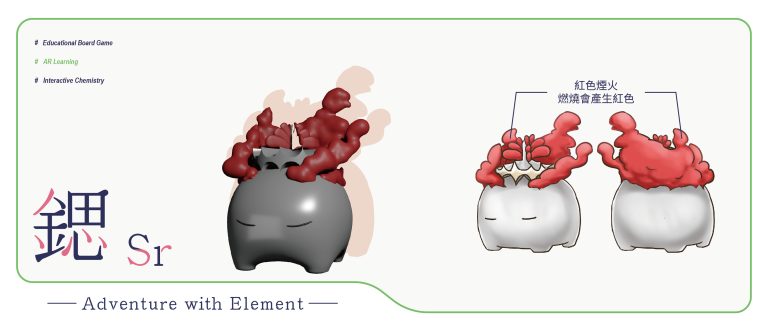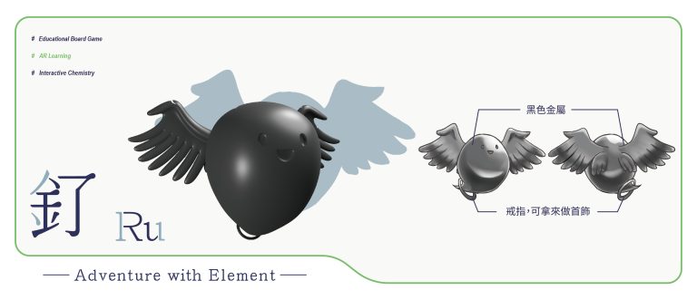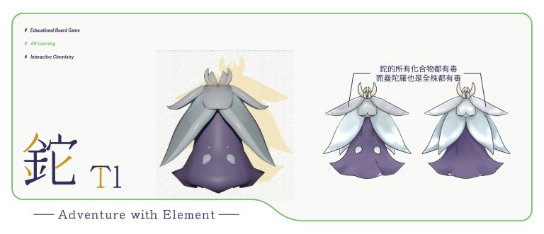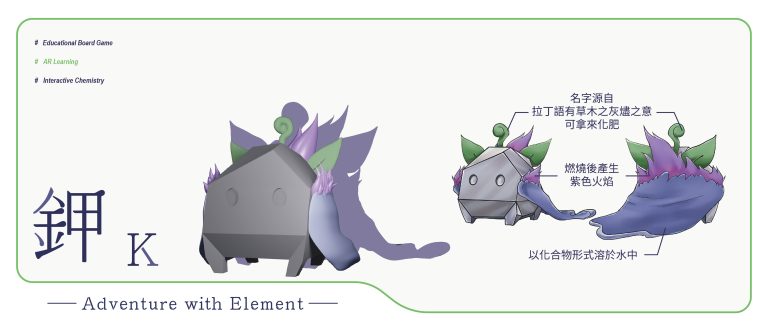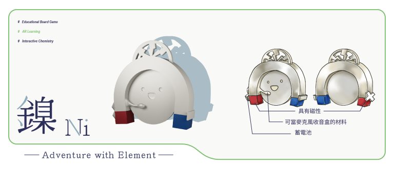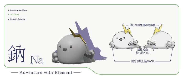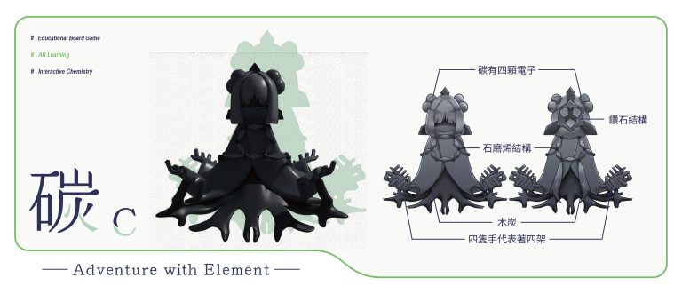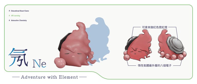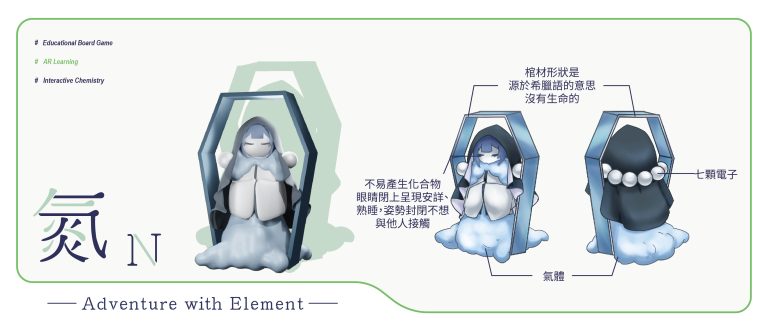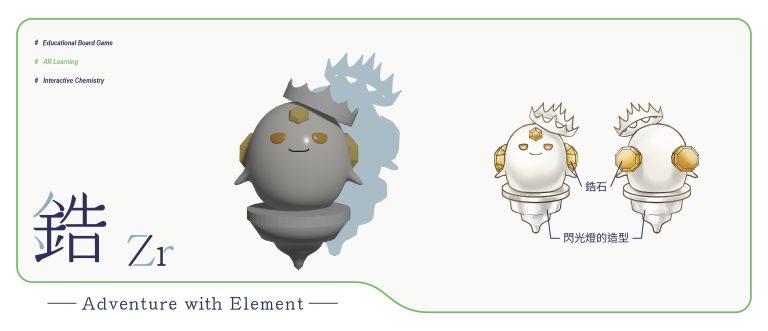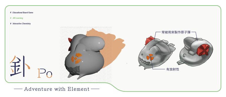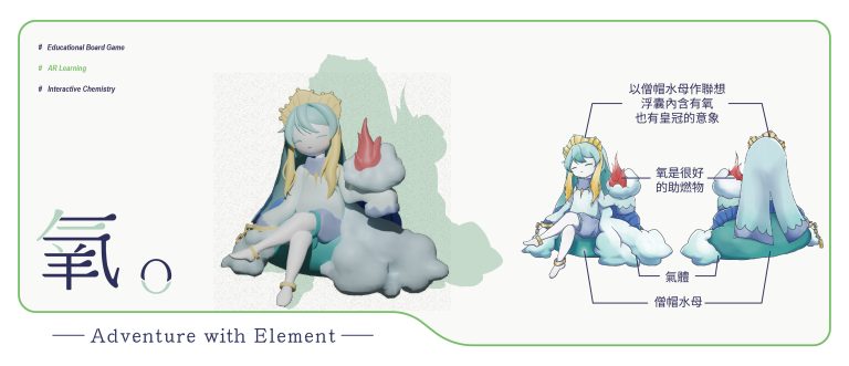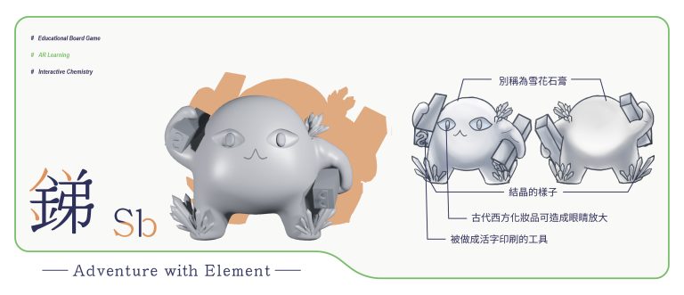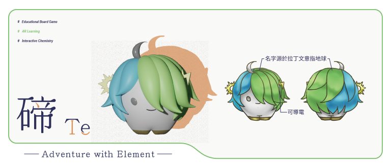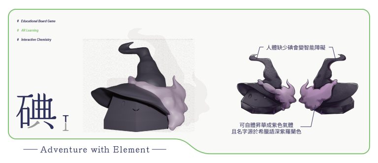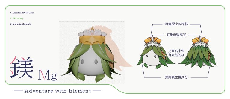 我們結合了AR,使玩家可以透過掃描棋子以及卡牌的方式去看到元素每位小精靈的樣貌和合成的小動畫,藉此增加玩家對該元素的印象。透過每個元素不同的化學性質、可製成的物品以及命名由來去繪製每位小精靈的樣貌,使每位元素精靈都成為獨一無二的存在。
