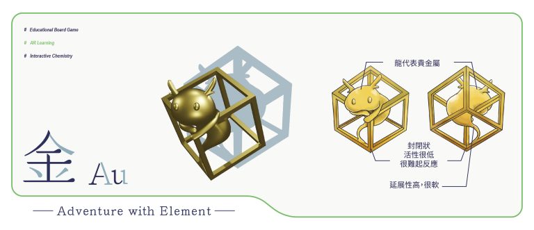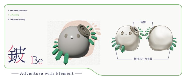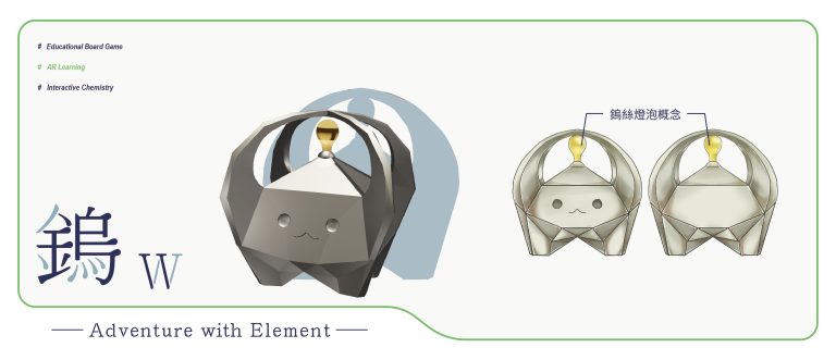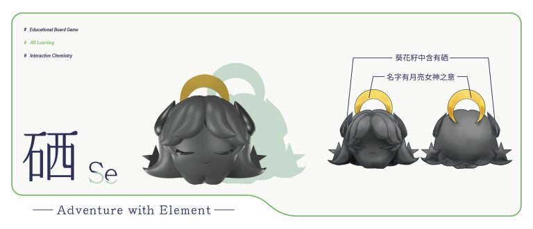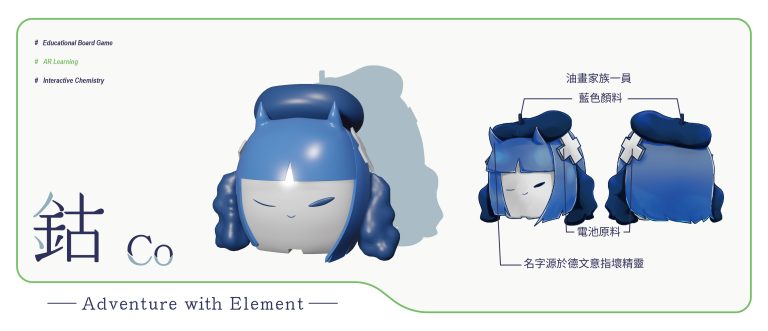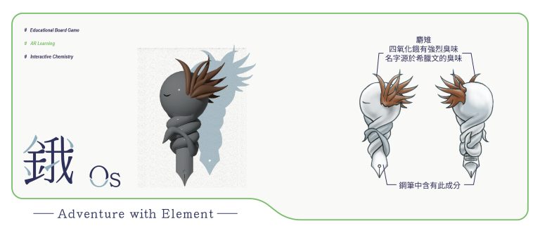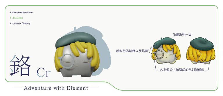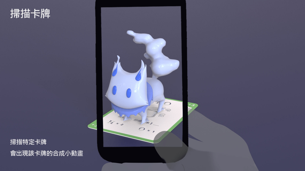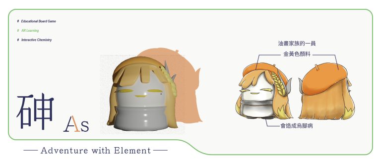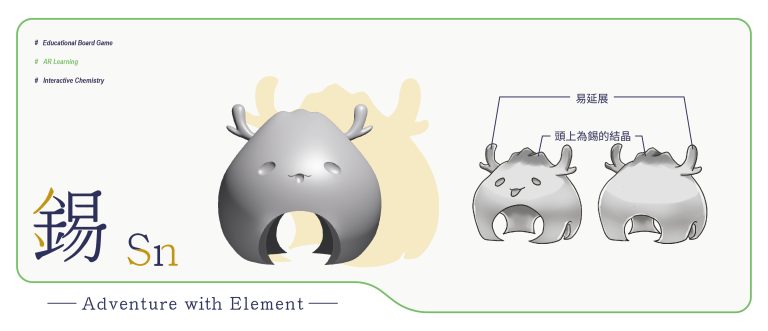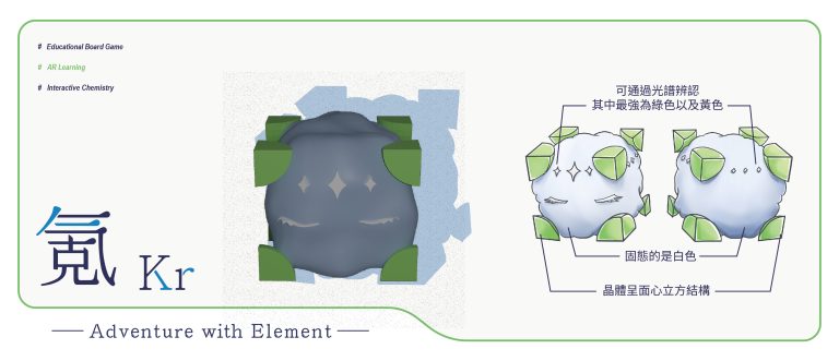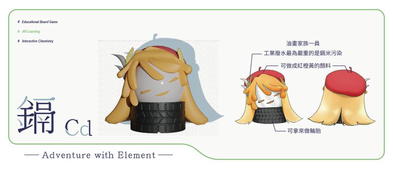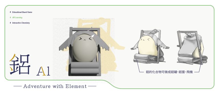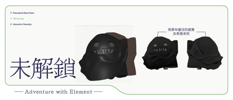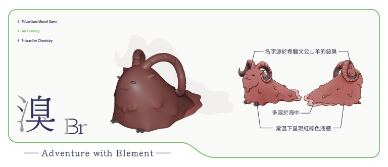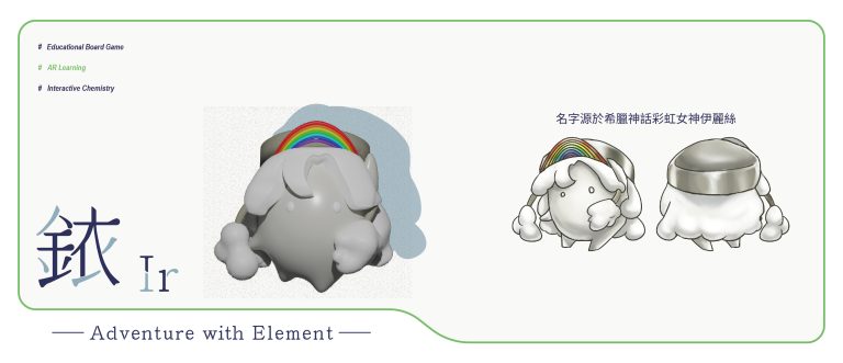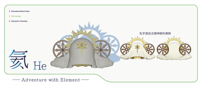 我們結合了AR,使玩家可以透過掃描棋子以及卡牌的方式去看到元素每位小精靈的樣貌和合成的小動畫,藉此增加玩家對該元素的印象。透過每個元素不同的化學性質、可製成的物品以及命名由來去繪製每位小精靈的樣貌,使每位元素精靈都成為獨一無二的存在。