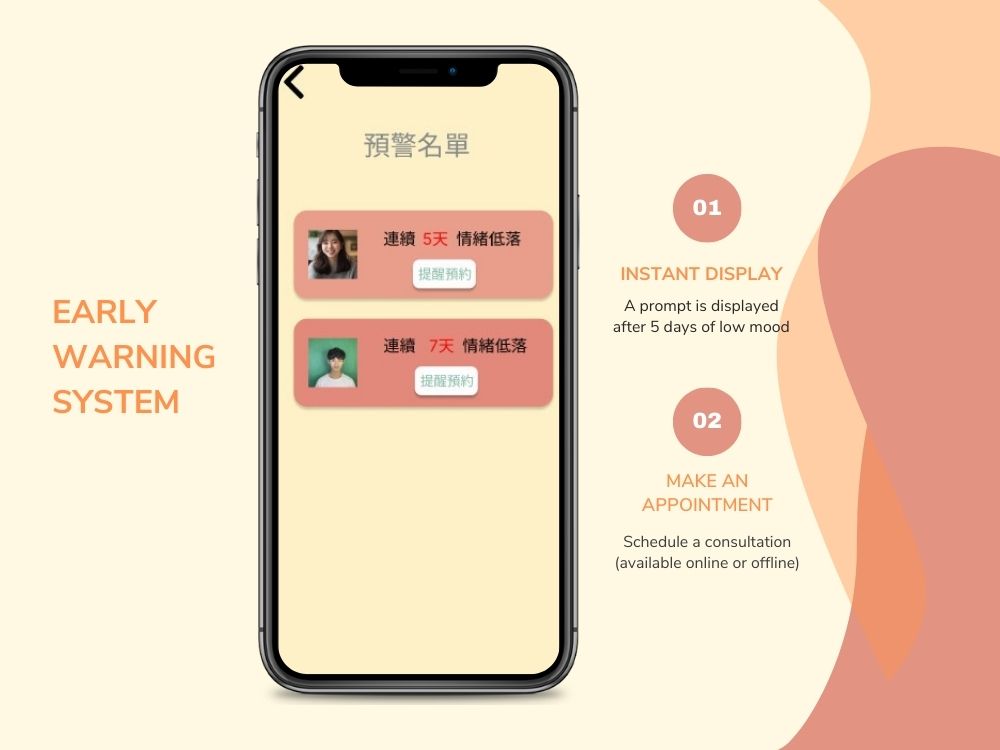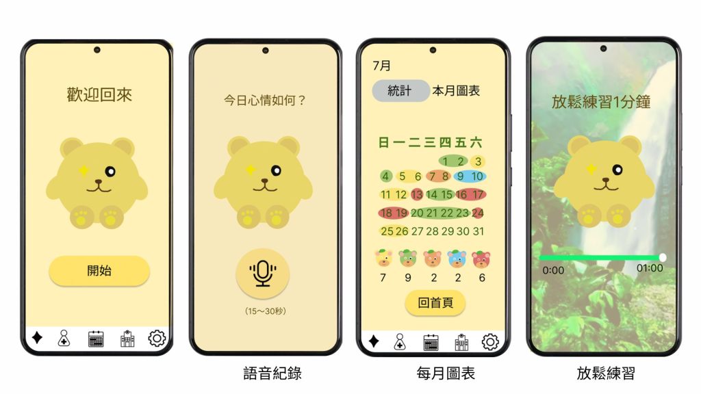 APP 提供視訊諮商、情緒月報表、預警提示等功能,讓使用者能夠追蹤情緒變化,獲得專業協助。